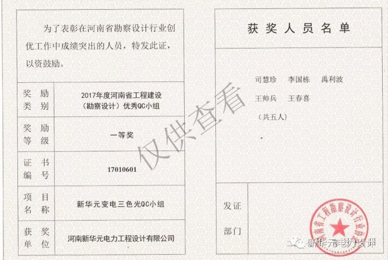 ![]() ◆河南省勘察设计行业协会颁发的“2017年度河南省工程建设(勘察设计)优秀QC小组”
