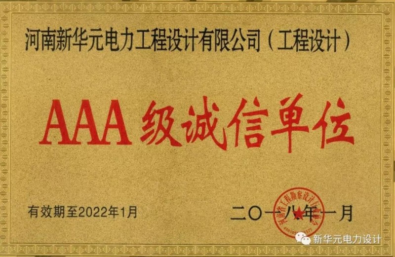 荣誉资质 河南新华元电力工程设计有限公司AAA级诚信单位-郑州电力设计院